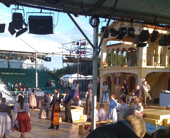 The woodland path leading up to the castle was strung with lights for the occasion so that when it went dark it felt like a journey into a fairyland. There was something just magical about it. Whoever made the decision to set the play in early 20th century Italy got it just right – the set and the costumes looked gorgeous and fitted well with that particular play. All the performances were faultless and the casting just right. If I’m honest, this was the first time I had seen this particular play and I wasn’t sure I’d like it (I usually go for the tragedies) but it was such fun and there was such a lovely atmosphere that you couldn’t help but get drawn into it. There was a pre-show, well, um…show, which was also really entertaining – loads of ladies in swishy skirts and men in swishy shirt sleeves playing folk songs, dancing with tambourines and telling jokes in fake Italian accents – just so cute. Daughter 1 – usually a thoroughly bored 21st century kid, completely lost her sense of not being bovvered and was dancing and clapping with everyone else with a massive grin.